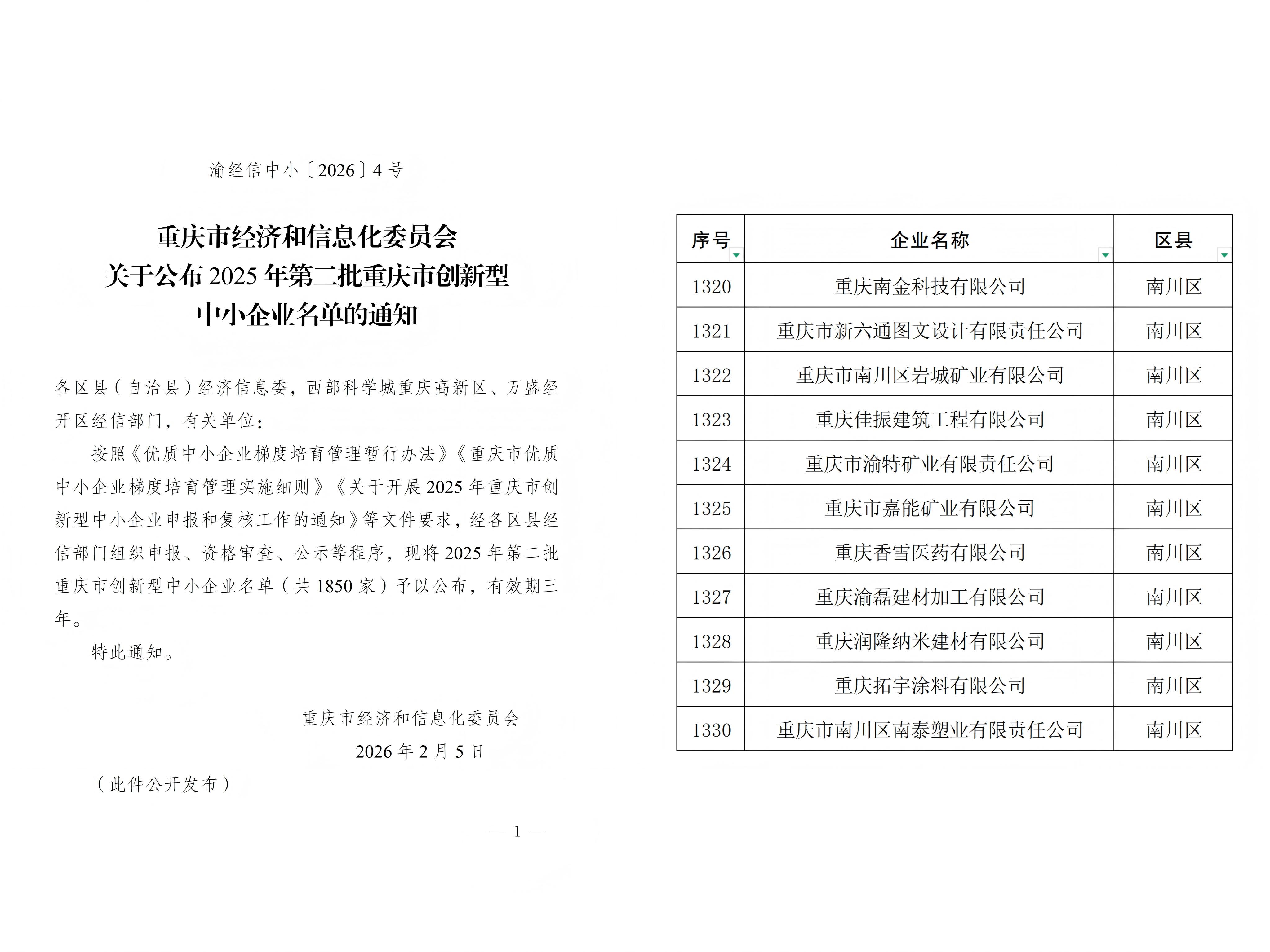 近日,市经济信息委公布2025年第二批重庆市创新型中小企业名单,我区重庆香雪医药有限公司、重庆拓宇涂料有限公司等11家企业入选。截至目前,我区一共有159家有效期内重庆市创新型中小企业。