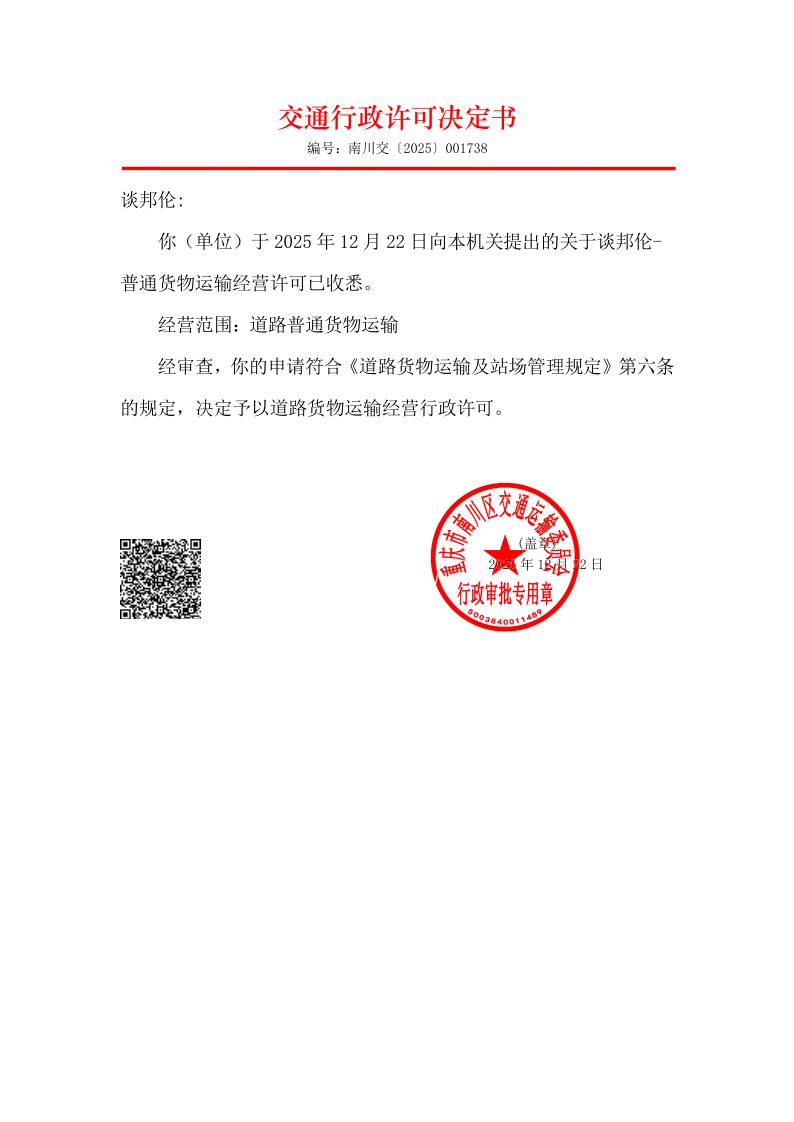 重庆市南川区交通运输委员会行政许可决定书