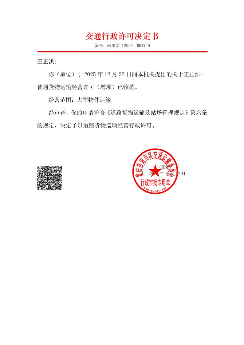 重庆市南川区交通运输委员会行政许可决定书