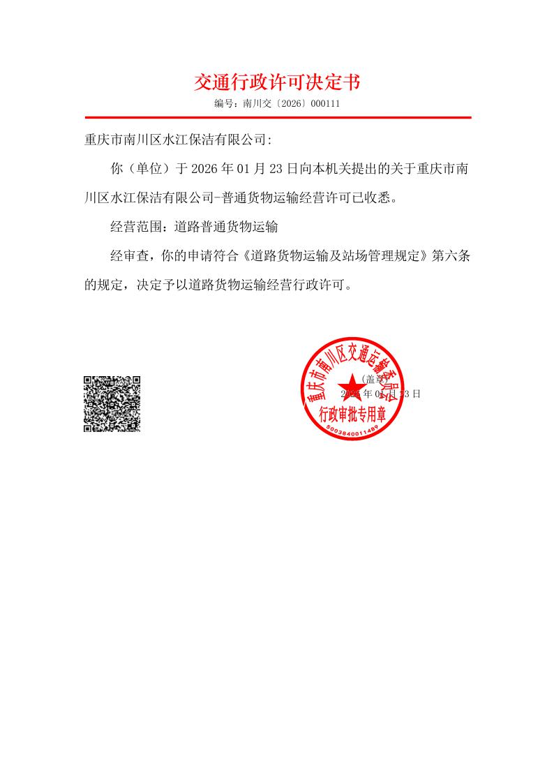 重庆市南川区交通运输委员会行政许可决定书