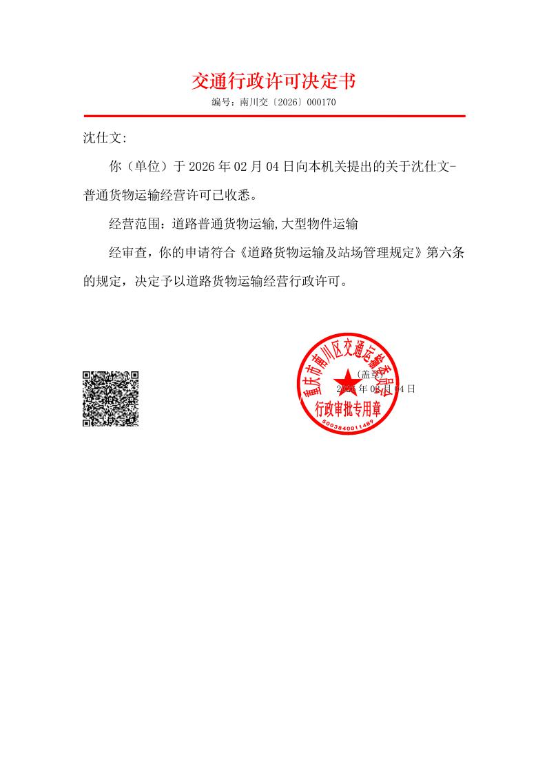 重庆市南川区交通运输委员会行政许可决定书