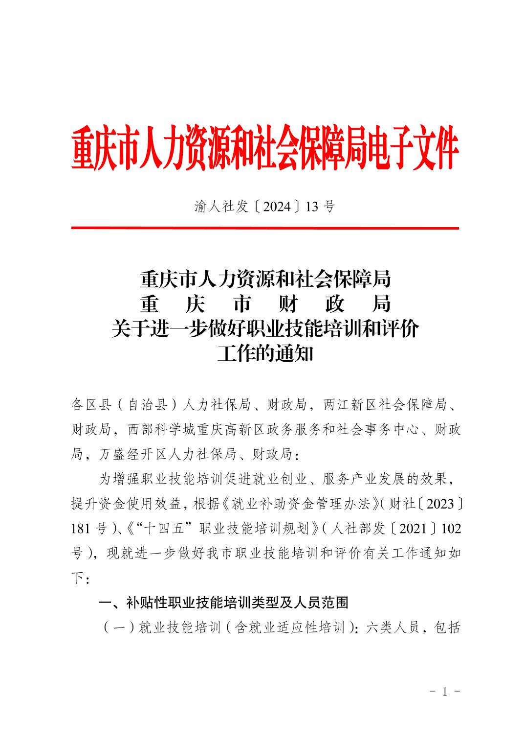 重庆市人力资源和社会保障局重庆市财政局关于进一步做好职业技能培训和评价有关工作的通知
