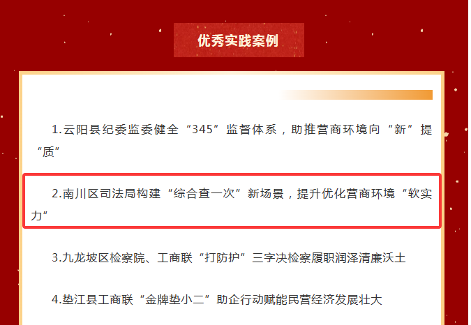 近期,清廉重庆建设总专班组织开展了第五批清廉重庆建设最佳案例和优秀实践案例培育推荐工作,全市清廉市场单元4个案例入选清廉重庆建设最佳案例、15个案例入选清廉重庆建设优秀实践案例,《南川区构建“综合查一次”新场景,提升优化营商环境“软实力”》上榜清廉重庆建设优秀实践案例。