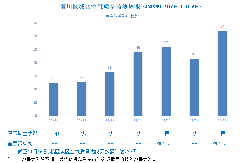 南川区城区空气质量监测周报(2025年11月10日—11月16日)