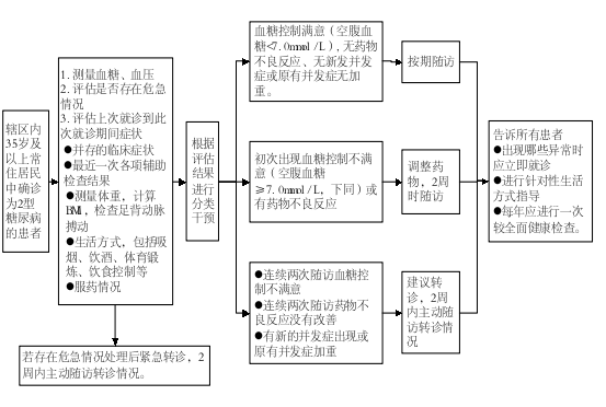 (1)测量空腹血糖和血压,并评估是否存在危急情况,如出现血糖≥16.7mmol/L或血糖≤3.9mmol/L;收缩压≥180mmHg和/或舒张压≥110mmHg;意识或行为改变、呼气有烂苹果样丙酮味、心悸、出汗、食欲减退、恶心、呕吐、多饮、多尿、腹痛、有深大呼吸、皮肤潮红;持续性心动过速(心率超过100次/分钟);体温超过39摄氏度或有其他的突发异常情况,如视力突然骤降、妊娠期及哺乳期血糖高于正常值等危险情况之一,或存在不能处理的其他疾病时,须在处理后紧急转诊。对于紧急转诊者,乡镇卫生院、村卫生室、社区卫生服务中心(站)应在2周内主动随访转诊情况。