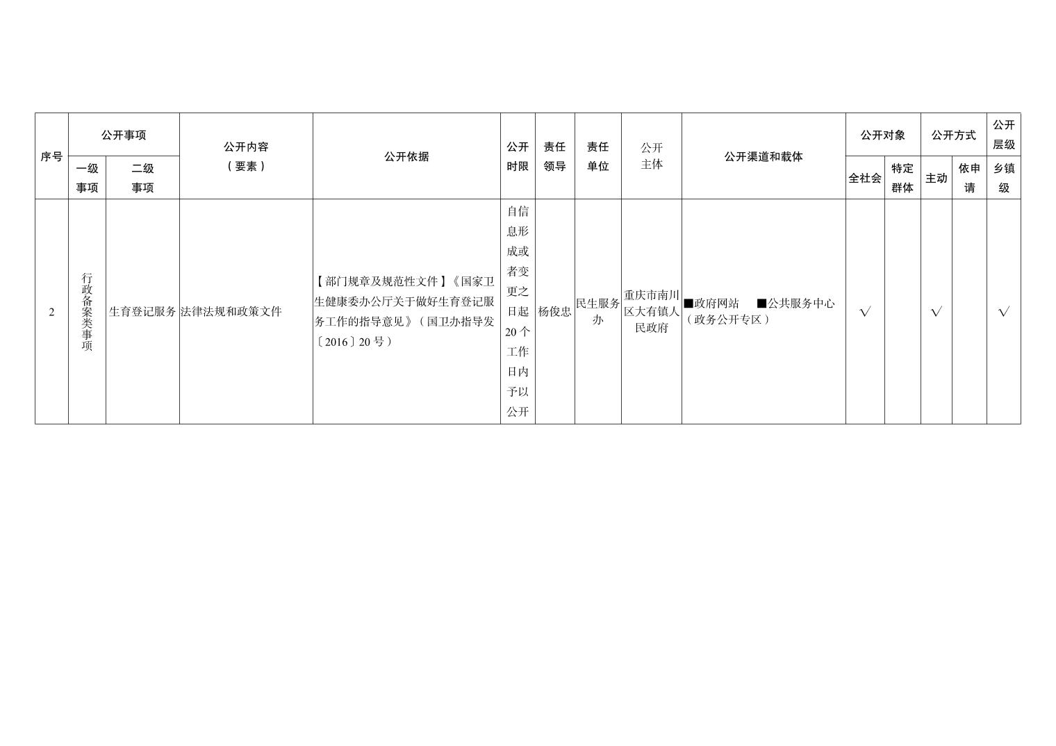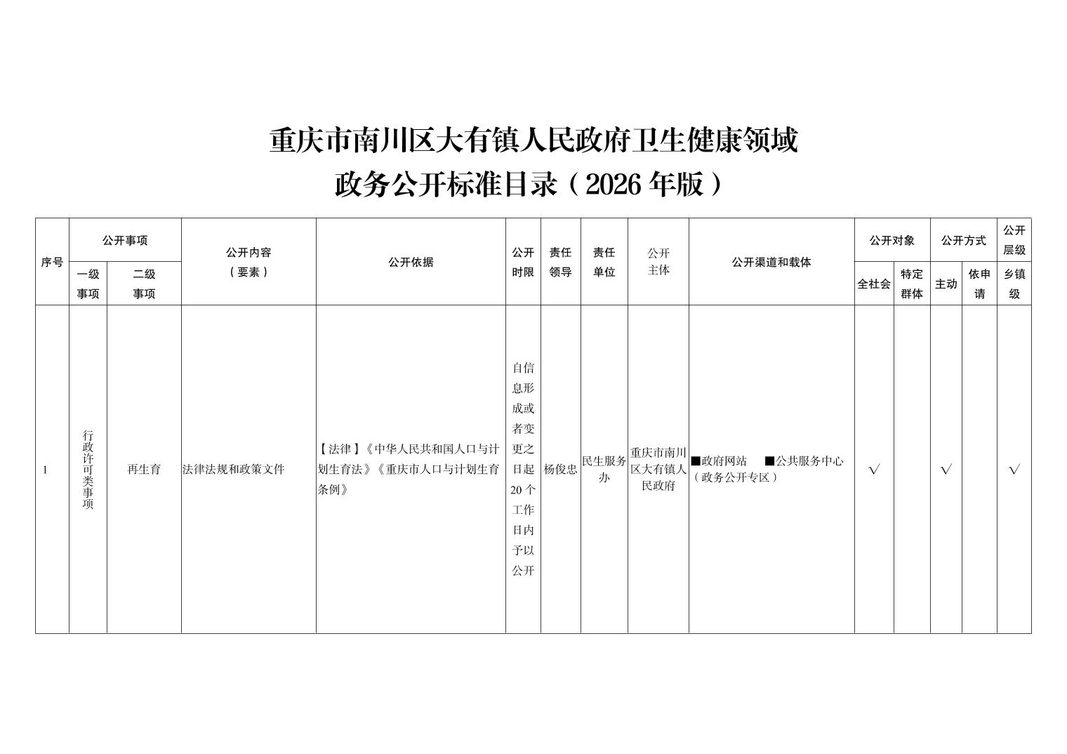 重庆市南川区大有镇人民政府卫生健康领域政务公开标准目录(2026年版)