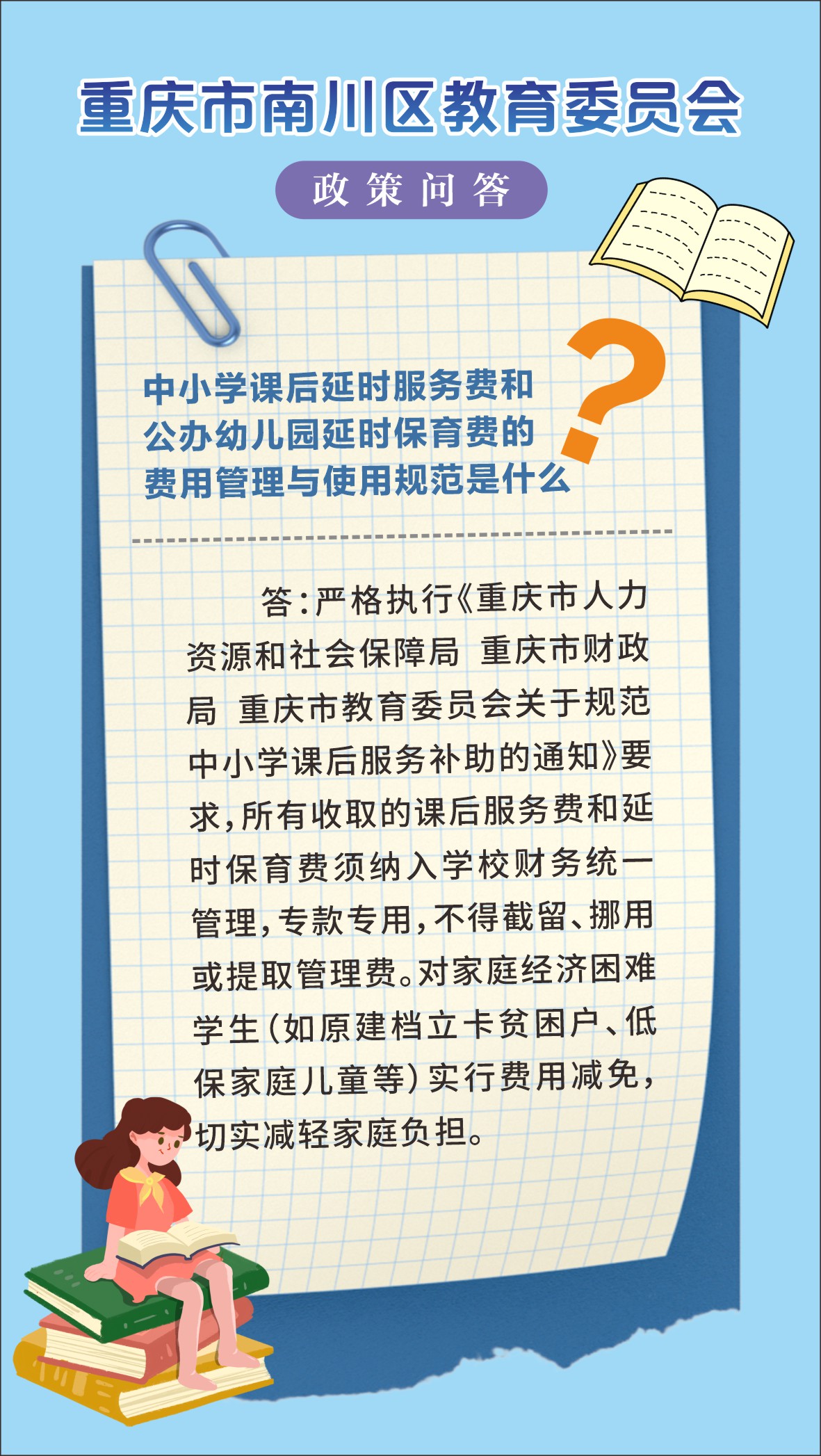 答:严格执行《重庆市人力资源和社会保障局 重庆市财政局 重庆市教育委员会关于规范中小学课后服务补助的通知》要求,所有收取的课后服务费和延时保育费须纳入学校财务统一管理,专款专用,不得截留、挪用或提取管理费。对家庭经济困难学生(如原建档立卡贫困户、低保家庭儿童等)实行费用减免,切实减轻家庭负担。
