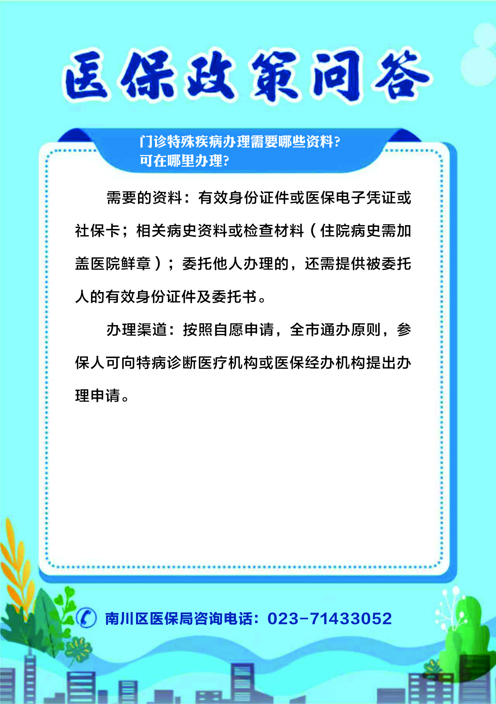 办理渠道:按照自愿申请,全市通办原则,参保人可向特病诊断医疗机构或医保经办机构提出办理申请。
