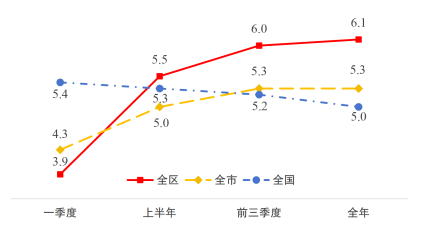 2025年全区GDP增速与全市、全国对比图(%)