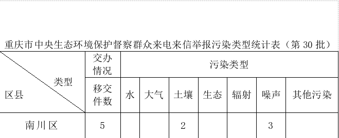 6月7日,中央第六生态环境保护督察组向重庆市交办第30批群众信访举报件109件,涉及我区5件,其中来电举报4件,来信举报1件,重点交办件0件。截至6月7日,中央第六生态环境保护督察组向我区共交办信访举报件37 件,其中来电举报28件(涉重点交办件3件),来信举报9件(涉重点交办件2件)。